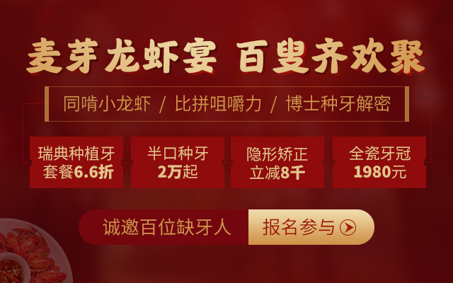 好牙享口福,第五期“麦芽百叟龙虾宴”现开启全城邀约,诚邀百位缺牙人共享鲜美龙虾宴,品尝精美下午茶,现在报名,活动当天还可享受硕博领衔专家智库看诊,听博士种牙公开课,互动赢好礼!