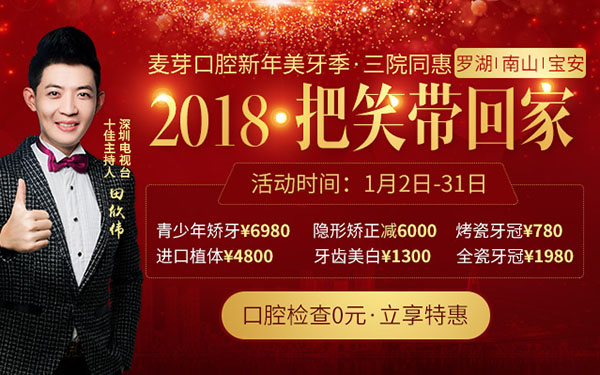 2018年新年伊始,麦芽口腔开启“新年美牙季”活动,给牙齿健康有恙、形态不美、色泽不佳等鹏城市民来一次“辞旧迎新”,三院齐享全家口腔健康检查套餐,期间矫牙除了优惠外,还能再减保持器费用,并获电动牙刷。