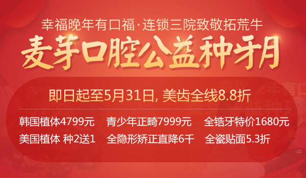 据悉,麦芽口腔在5月惠及全城缺牙人的公益活动正式启动。为帮助更多的缺牙顾客重拾口福健康,公益种牙月进口种植体特价4799元,欧美种植体立减2800元,美国种植体种2送1,通过网络预约的顾客还将享受由麦芽种植专家团量身定制的价值1280元的种牙方案设计,了解自己适合何种种植技术,您可以在线预约客服或者直接拨打我们的热线电话0755-82339968!