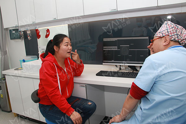 麦芽口腔的专业医生为向女士做了口腔CT检查后,向她介绍了义齿修复的种类及优劣势。面对活动假牙、烤瓷桥还是种植牙的选择时,向女士权衡利弊后,决定做麦芽种植牙!