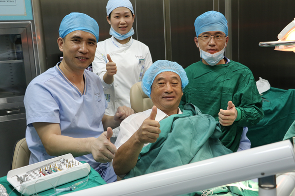 孙博建议拔除松动牙,并结合陈老伯的实际情况,为其制定了微创无痛种植方案。在上牙左右两侧各植入2颗种植体,采用搭桥连冠的方式,各恢复3颗牙齿,右下植入2颗种植体,达到植入6颗种植体,恢复8颗牙齿的种植方案,陈老伯对此方案也很满意,并且立即实施了种植牙手术。