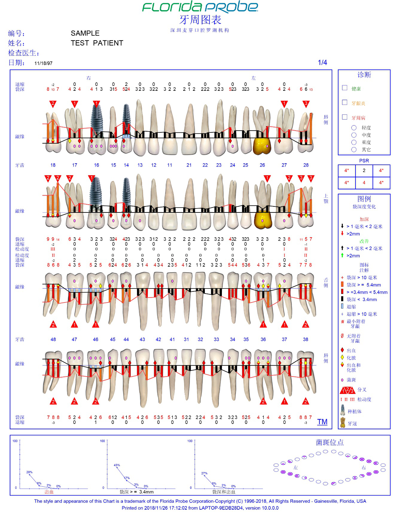 系统自带的风险评估功能,会根据患者的牙周健康情况发出“警告”、“危险”、“出血”、“溢脓”等语音提醒,让患者直观、清晰的了解自己的牙周健康状况。病人复诊时,还能及时反馈初诊病情,对比治疗前后的效果等,方便医生制定更详细的治疗方案,为牙周病患者得到有效治疗提供了福音。