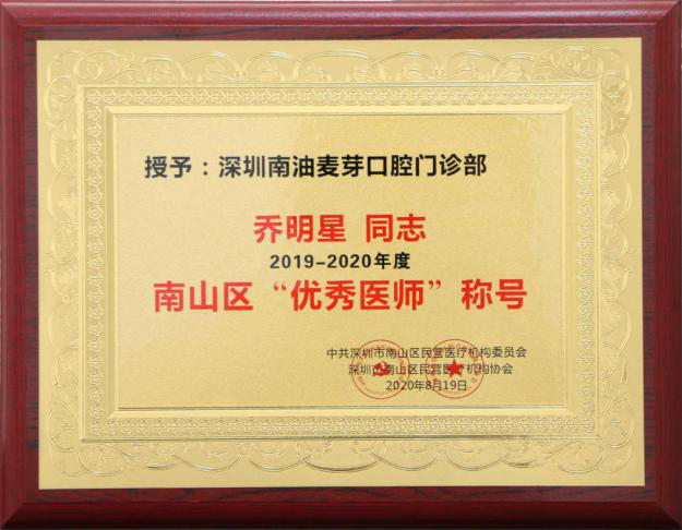 据悉,本次年度表彰旨在大力弘扬“敬佑生命、救死扶伤、甘于奉献、大爱无疆”优良医学传统,营造全社会尊医重卫的良好氛围,激发南山区民营医疗机构医务工作者的工作热情。对于被评为先进人物,身为党员的乔明星医师则谦虚地表示:“非常荣幸能获得南山区民营医疗机构年度优秀医师,我将继续起好党员的带头作用,投入更大的热情到日常工作中,不断精研医技,用心服务好每一位患者,为更多市民送去口福。另外,这份荣誉,不是属于我个人的,它属于麦芽口腔品牌连锁,是我们麦芽人共同的骄傲,更是促进我们不断进步的鼓励与鞭策。”