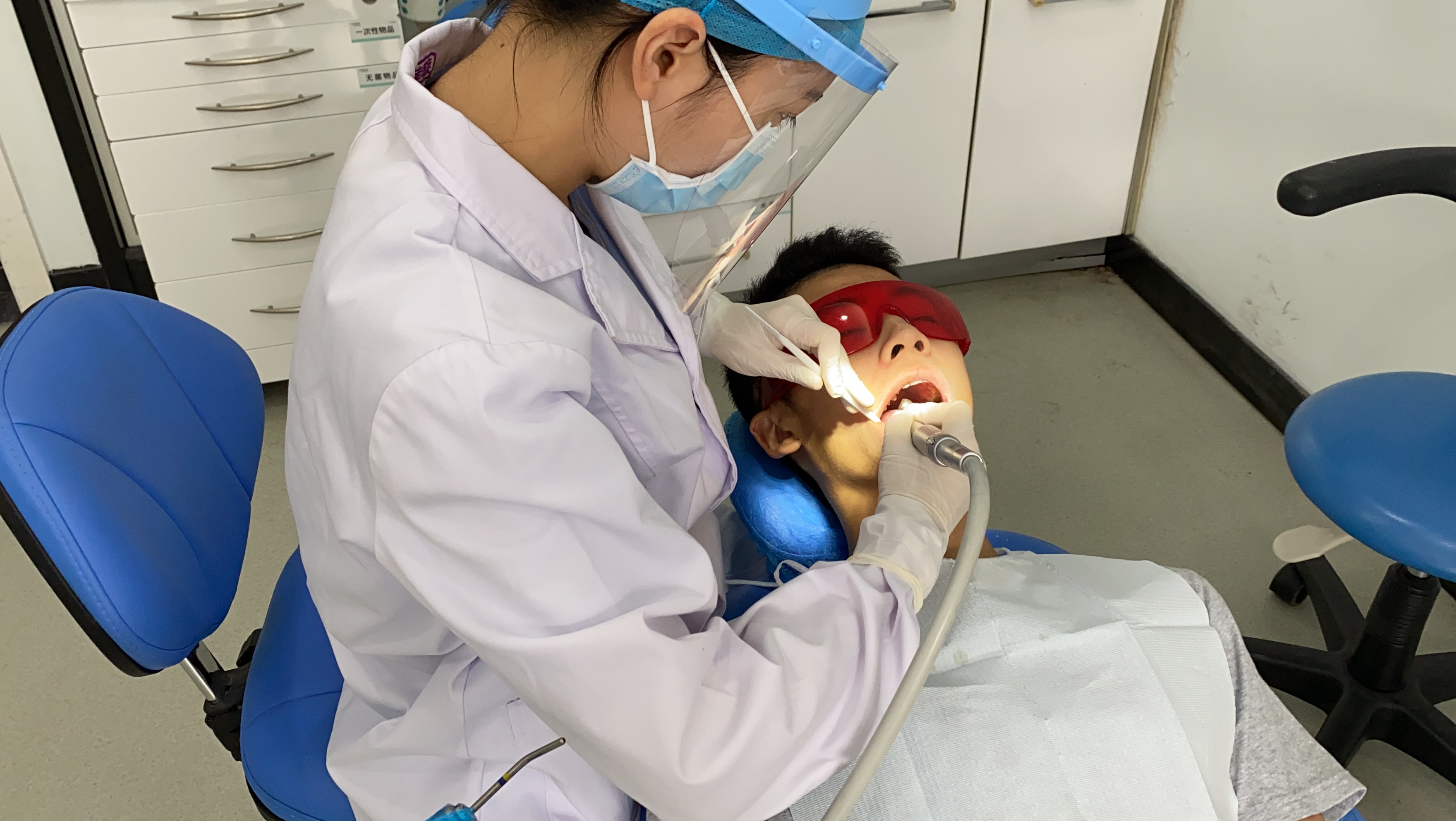 摘下矫治器,护士为子润洁牙