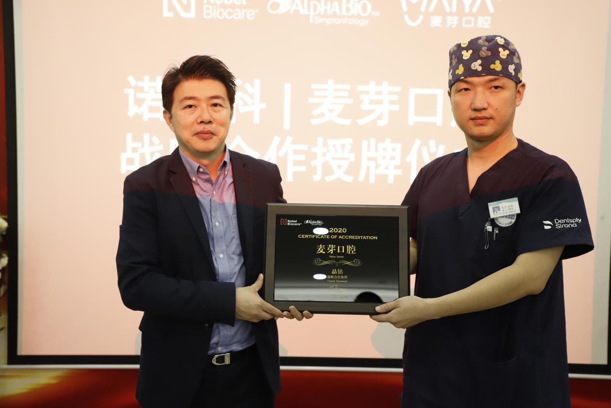麦芽口腔罗湖机构种植中心田忠奇主任与Nobel Biocare 公司种植事业部总经理许邦达先生出席了授牌仪式,并进行了深入的交流和探讨。该合作的建立也标志着麦芽口腔将与诺保科品牌迈入优势互补、协同发展的合作新阶段。