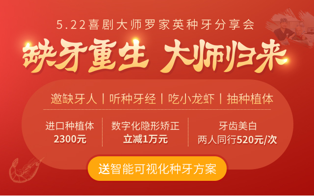 民以食为天,没有一口好牙如何能吃上一顿好饭?为帮助广大缺牙朋友尽早恢复一口好牙,畅享美味佳肴,5月22日,麦芽口腔特别策划喜剧大师罗家英种牙分享会,活动当天,不仅能倾听“唐僧”扮演者、香港喜剧大师罗家英种牙的个中感受,还可获得与种植博硕专家团一对一沟通的机会,参与活动还有机会获得免费进口种植体,享半口种牙2万起、种植牙特价3980元等多重优惠。如果您是缺牙人,请马上拨打8266 9968预约报名,名额有限,先约先得。