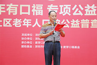 深圳市老年人体育协会秘书长刘春晖在开幕词中讲到,此次公益普查活动,是麦芽口腔关爱缺失牙市民的一次爱心之举,希望通过这样的活动,让更多缺牙市民得到口腔健康检查,享受到口腔基金援助,重新拥有一口好牙,找回晚年的幸福。