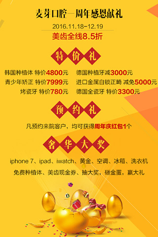 院庆期间,韩国种植体仅4800元,金属托槽正畸特价7999元,烤瓷牙特价780元……全线85折,消费满还送好礼,限12月19日前。