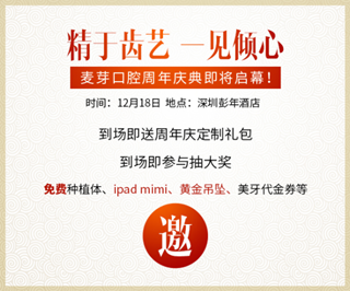 俯仰之间,麦芽口腔已悄然走过一年历程,这一年间,成功帮助近两万名患者重享健康好牙,深受深圳市民的信赖和好评。在一周年到来之际,为答谢新老客户对麦芽口腔的支持和信赖,帮助更多的人找回口福,传递爱和幸福,麦芽口腔在社会各界的大力支持下,特于12月18日在深圳彭年酒店举行周年庆典专场活动,不但为你准备了精彩节目与精致茶点,还有抽大奖、砸蛋送豪礼、任意充值送,三重惊喜,期待您的参与!